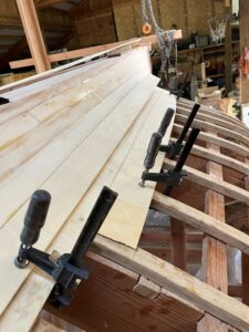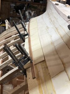 My new mantra is “Make one, put one.” Making a plank section and putting one on takes me about six hours. (Did I mention I am working by myself.) Each run of a plank is made up of at least three sections and there is an inner and an outer. I figure I have eleven rows left or 44 total (counting the inner and outer and each side). That is two runs per week so if I can keep up that pace I would be finished planking in 22 weeks, by August. Of course this leaves no time for fishing, sailing or any of those other things I used to do. So, who knows if I can keep this schedule. But I do know one thing for sure: any day in my shop is better that a day in chemistry class.